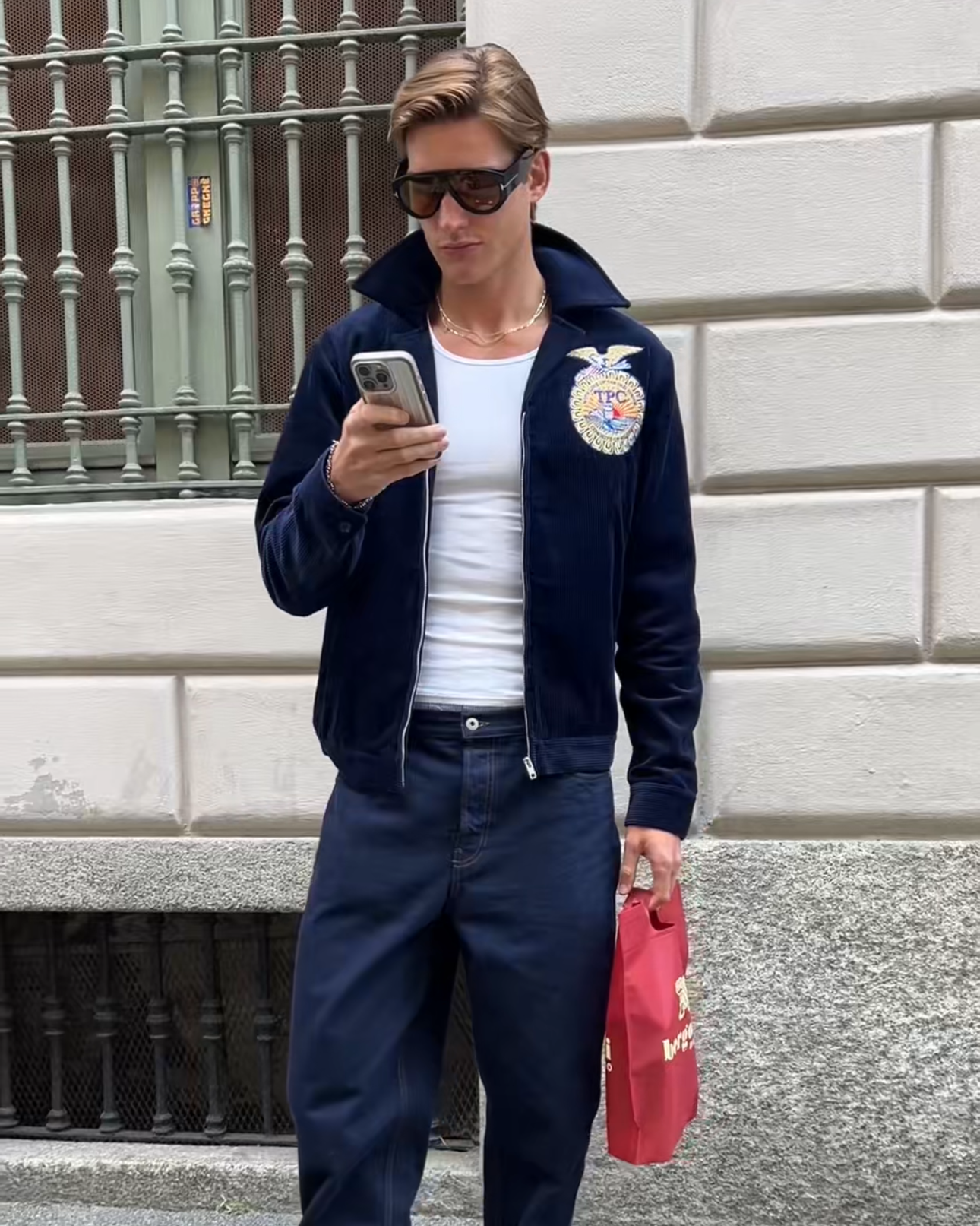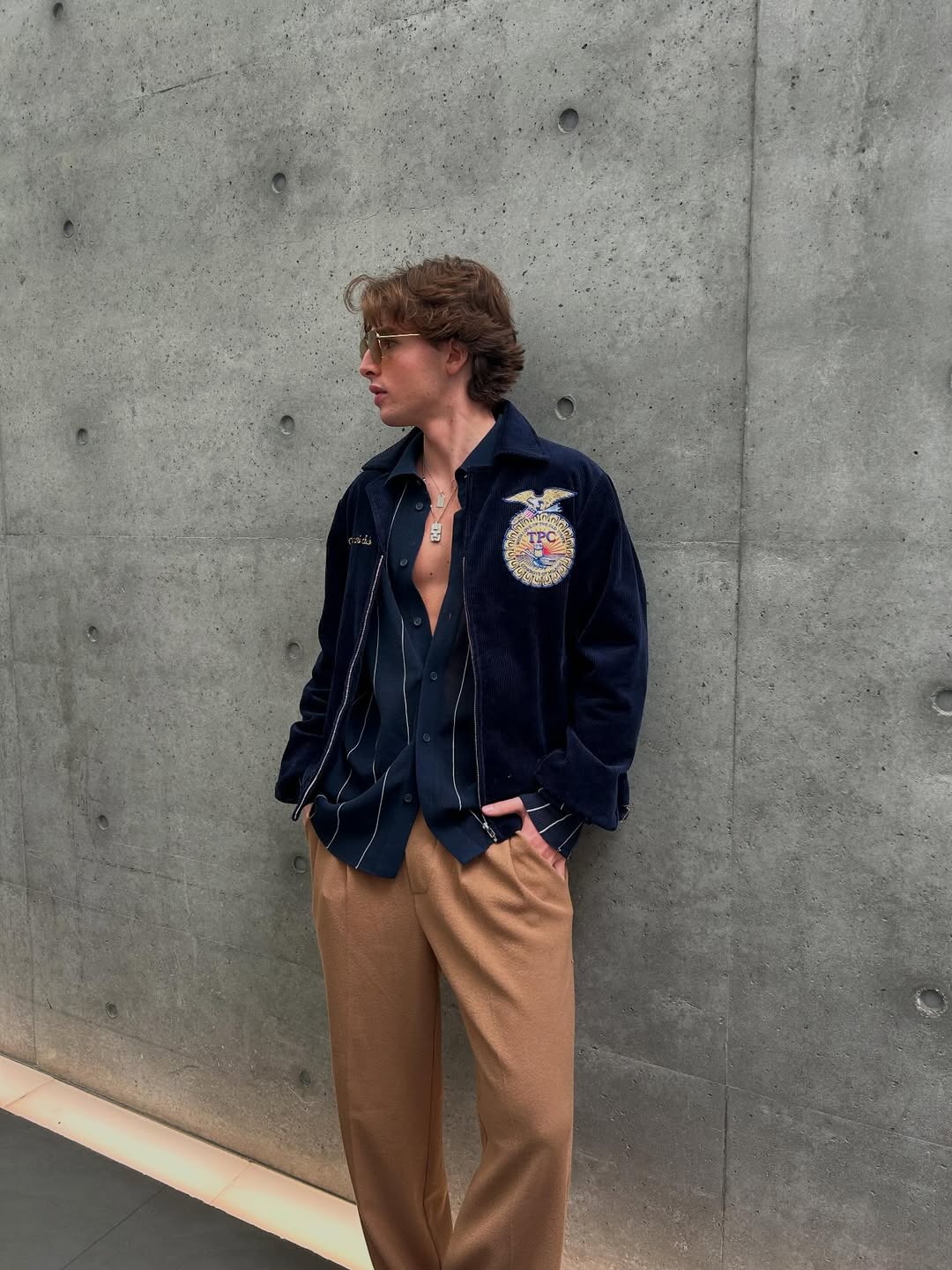 This navy corduroy western jacket is inspired by the iconic Vintage FFA jacket with references to the Milanese Paninari. It features embroidery on the left chest and custom patches on the front and back, with bold yellow-gold stitching highlighting the deep navy corduroy.